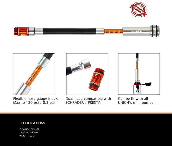 The flexible hose gauge can be fit with all UNICHE’s mini pumps that provides an easy read tire pressure while pumping. |