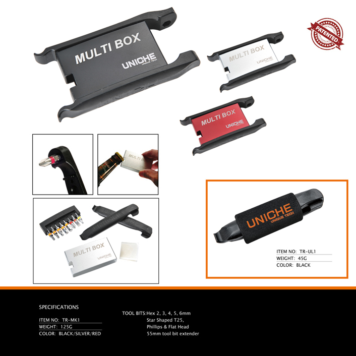 The great idea of UNICHE tire repair kit which combine with tool and patented. The versatile kit included tire lever, bottle opener, 8 kinds of 1/4" tool bits, tool bit extender and also can store the glueless patches inside.