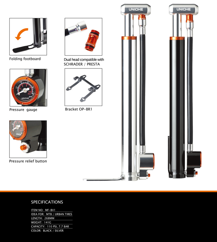 It is like a floor pump but minimized so that you can carry it when you ride. UNICHE MINI FLOOR PUMP is a lightweight and durable hand pump which is made from CNC machined aluminum. It is available in big-volume modes, which easily inflates tires with fewer strokes. The big volume MINI FLOOR PUMP will work with mountain bikes, which can easily tires with fewer strokes. |